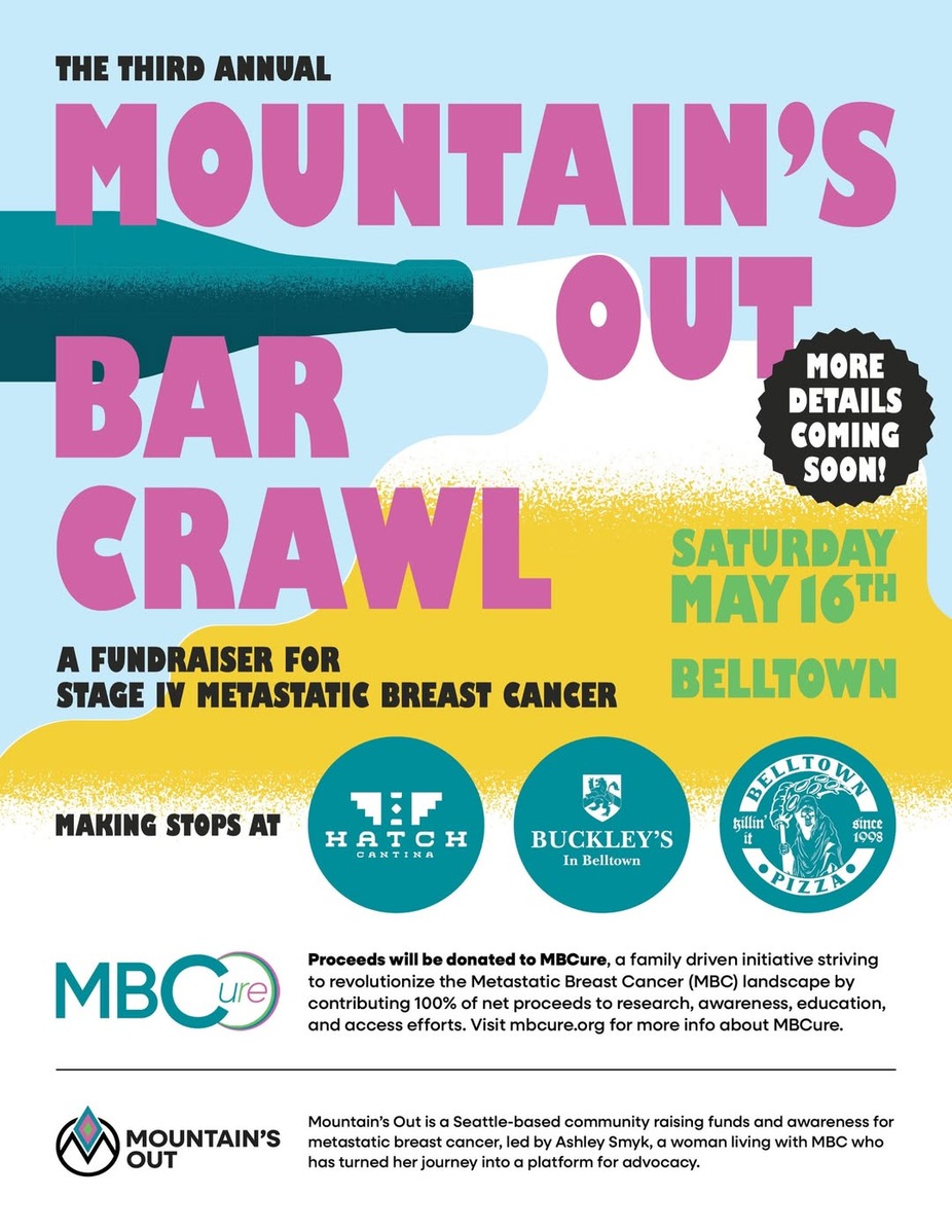 The 3rd Annual Mountain's Out Bar Crawl is back with three of Belltown's most-loved local bars. Cruise between Belltown Pizza, Hatch Cantina, and Buckley's Belltown to help raise funds and awareness for Stage IV Metastatic Breast Cancer. Every step, every toast, every stop helps fuel research, education, and hope through MBCure. More details coming soon.